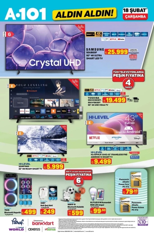Türkiye’nin en büyük perakende zincirlerinden A101, Şubat ayının en kapsamlı aktüel kampanyalarından birini duyurdu. 18 Şubat itibarıyla geçerli olacak indirim listesinde yüksek segment televizyonlardan büyük kapasiteli beyaz eşyalara, elektrikli mopedlerden temel gıda ürünlerine kadar geniş bir ürün yelpazesi yer alıyor. Kampanyanın sınırlı stoklarla sunulacak olması nedeniyle mağazalarda yoğunluk bekleniyor.