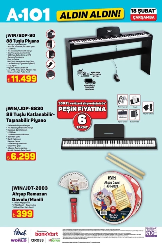 Müzik aletleri kategorisinde 88 tuşlu dijital piyano 11.499 TL’den satışa çıkıyor. Katlanabilir ve taşınabilir model ise 6.299 TL fiyat etiketiyle dikkat çekiyor.