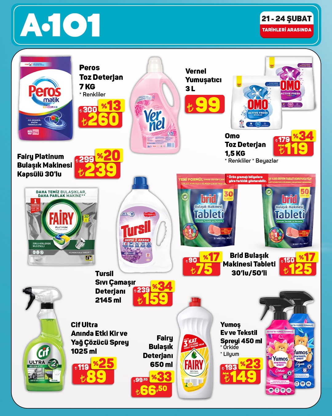 A101, 21-24 Şubat tarihleri arasında temizlik ürünlerinde dikkat çeken indirimler sunuyor. Çamaşır deterjanından bulaşık tabletine, yumuşatıcıdan yüzey temizleyiciye kadar birçok üründe fiyatlar geriledi.