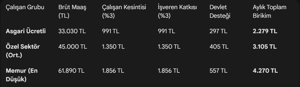Sistemde birikimler brüt maaş üzerinden hesaplanacak. İşte 2026 projeksiyonuna göre çalışanların cebinden çıkacak tutarlar ve fonlarında birikecek aylık toplam miktarlar: