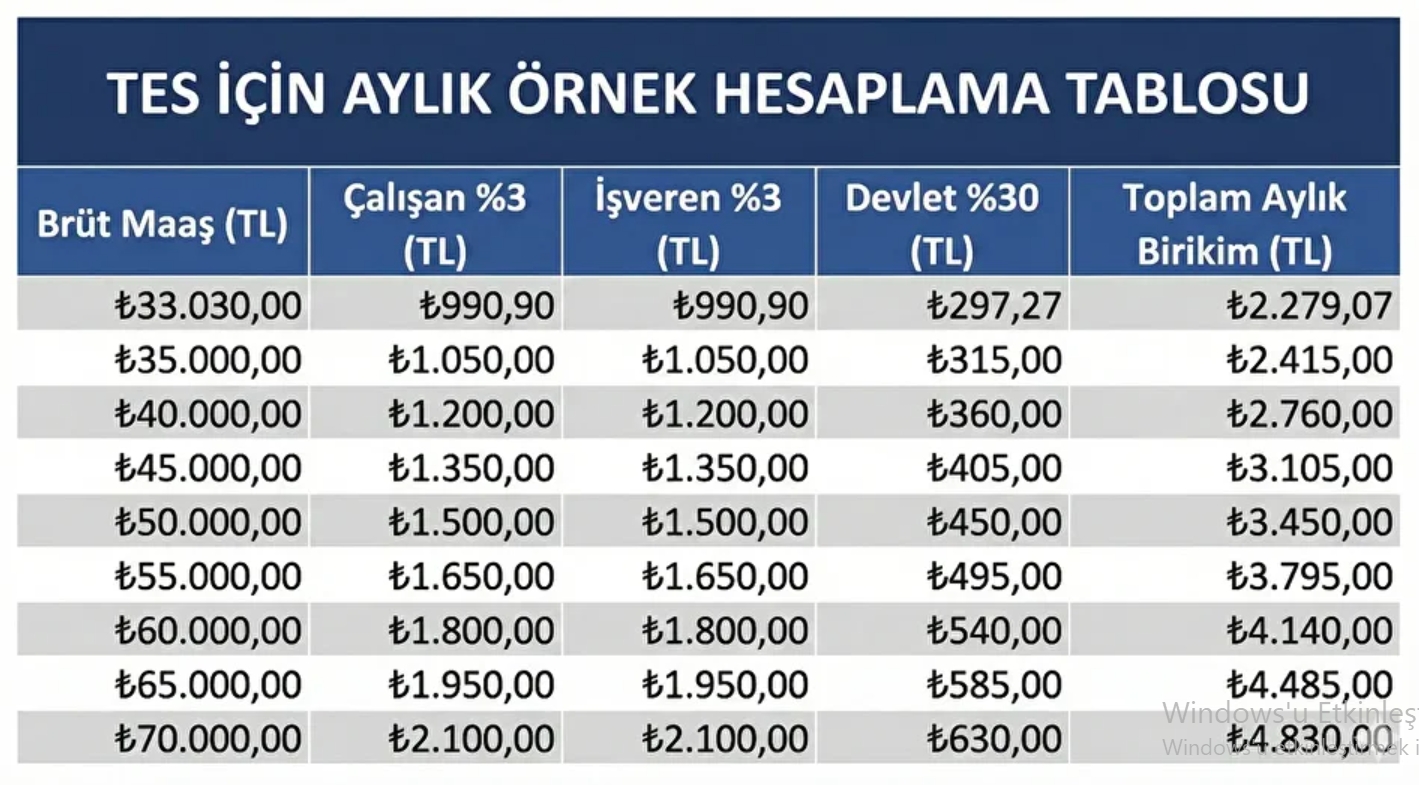 Özellikle genç yaştaki çalışanlar için TES, ciddi bir sermaye biriktirme aracına dönüşebilir. Mevcut brüt asgari ücret üzerinden yapılan simülasyona göre; bir asgari ücretlinin fonunda (ek getiriler hariç, nominal olarak) 10 yıl sonunda yaklaşık 309 bin TL, 20 yıl sonunda ise 618 bin TL birikmesi öngörülüyor. Emeklilik yaşı geldiğinde bu tutarlar aylık “ikinci maaş” olarak ödenebilecek veya toplu para olarak alınabilecek.
