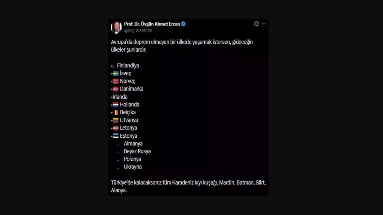 Ercan, Avrupa’da deprem riski oldukça düşük olan ülkeleri sıralayarak, aktif fay hatlarından uzak coğrafyalara dikkat çekti.